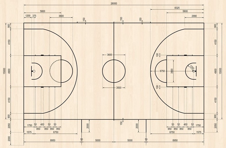 - Kích thước sân bóng rổ tiêu chuẩn (thi đấu 5vs5 – chuẩn FIBA): 28,0 m (dài) × 15,0 m (rộng).