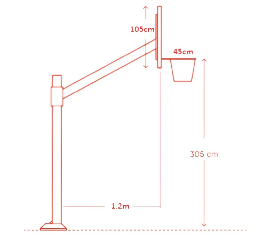 - Trụ có tay vươn (overhang) để mép bảng cách baseline ≥ 1,20 m (giúp an toàn khi lên rổ).