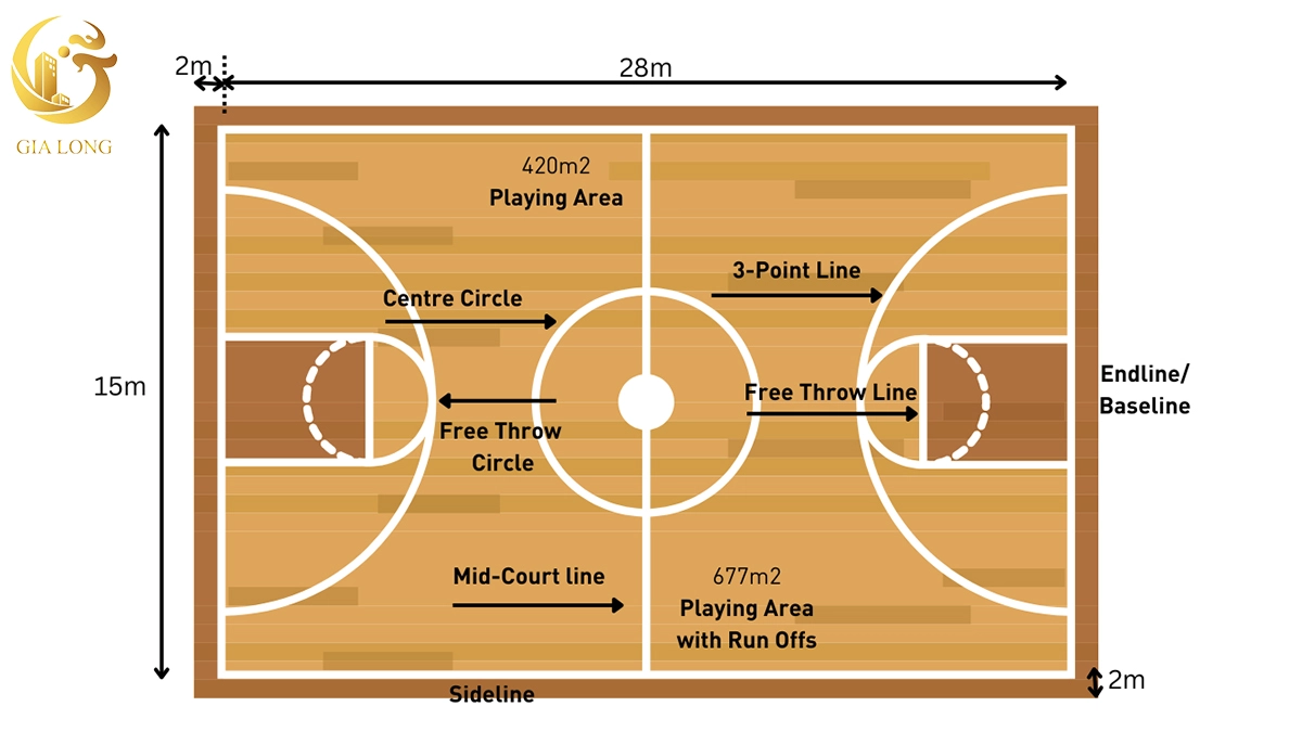 → 28 × 15 m, diện tích 420 m² (chuẩn FIBA cho 5vs5).