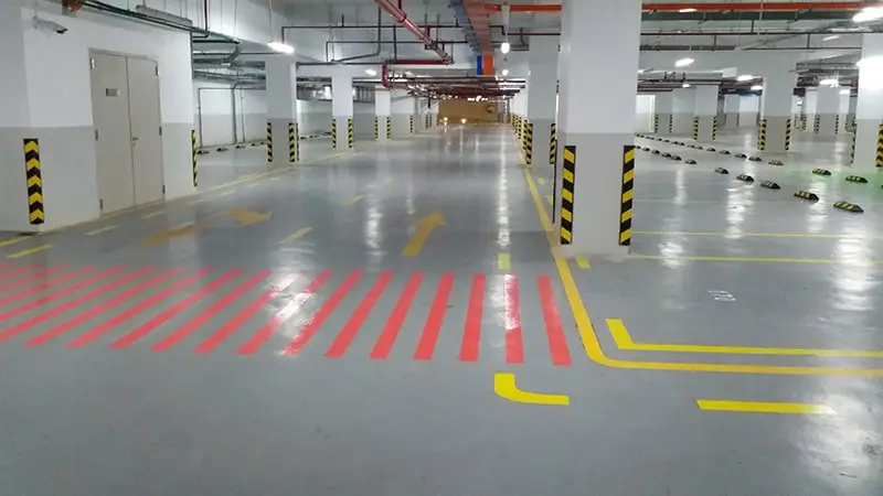 | Bãi xe | Epoxy 2K + UV topcoat | Ô & số | 9016/1023 | R10 | Ngoài trời: kháng UV |