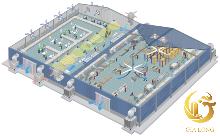 Bài viết này giới thiệu chi tiết dịch vụ thiết kế & thi công hệ thống thông gió nhà xưởng chuyên nghiệp của Công ty xây dựng Gia Long, đồng thời cung cấp các kiến thức nền tảng về nguyên lý thông gió nhà xưởng, tiêu chuẩn thông gió nhà xưởng và cách tính toán thông gió nhà xưởng để chủ đầu tư, chủ xưởng, kỹ sư cơ điện tham khảo.